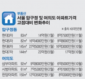 또 현대5차 82㎡는 2010년 1월 16억4000만원에서 올해 11월 9억8000만원으로, 현대6차 145㎡는 2010년 1월 22억5000만원에서 올해 10월 16억3000만원으로 각각 하락했다.