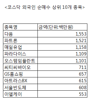 [코스닥 외국인 순매수 상위 10개 종목]