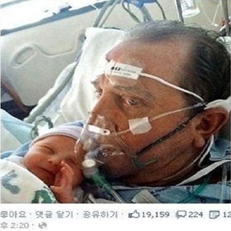 최근 해외 온라인 커뮤니티에 공개된 이 사진은 '아빠의 마지막 45분'이라는 제목으로 올라왔다. 사진 속 산소 마스크를 끼고있는 한 성인 남성은 태어난 지 얼마 되지 않아 보이는 신생아를 안고 있다.