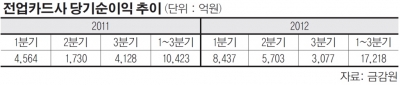 금감원이 27일 내놓은 ‘2012년 1~9월 중 신용카드사 영업실적’ 자료에 따르면 지난 9개월간 7개 전업카드사의 순이익은 1조7218억원을 기록, 작년 같은기간 순이익(1조423억원)보다 65.2% 늘어났다.