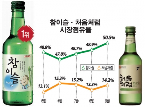 27일 주류산업협회에 따르면 면세를 제외한 하이트진로의 참이슬은 지난 9월 한달간 총 489만1000 상자(360㎖×30병)를 출고해 시장점유율 50.5%를 기록했다.
