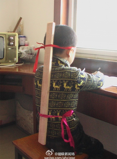 공개된 사진 속에는 초등학생으로 보이는 한 어린아이가 등뒤에 각목을 묶은채로 책상에 앉아 공부에 열중하고 있어 눈길을 끈다.