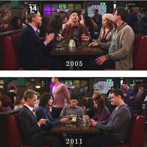 사진 속에서 스마트폰이 거의 없었던 2005년도에는 술집에 모인 사람들이 서로 얼굴을 마주보며 즐겁게 담소를 나누고 있다. 그러나 스마트폰이 보급된 2011년, 사람들은 모임에 가서도 핸드폰을 보느라 정신이 없다.