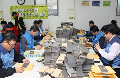 강서나누리센터는 20여명의 장애인이 임가공을 통해 장애인의 직업 활동과 일자리창출을 도모하는 장애인직업재활시설이다. 신한은행이 지난해 7월부터 정기적으로 방문해 밀린 일거리를 돕는 봉사활동을 하고 있다. 이날 신한은행 임원과 본부장들은 장애인들과 함께 볼펜조립을 도우며 나눔을 실천하는 시간을 가졌다.