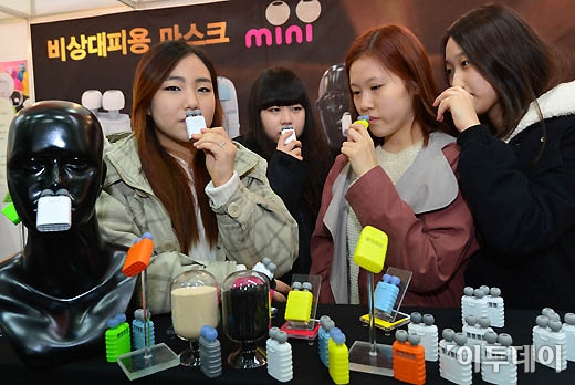 29일 서울 삼성동 코엑스에서 열린 대한민국발명특허대전을 찾은 관람객들이 화재등 긴급상황에서 사용하는 비상대피용 소형마스크를 살펴보고 있다.