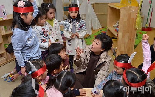 새누리당 박근혜 대선 후보가 29일 공식 선거운동 사흘째를 맞아 첫 서울 유세로 여의도 증권거래소 직장 어린이집을 방문해 원생들과 이야기하고 있다.