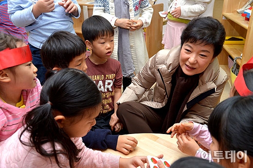 새누리당 박근혜 대선 후보가 29일 공식 선거운동 사흘째를 맞아 첫 서울 유세로 여의도 증권거래소 직장 어린이집을 방문해 원생들과 이야기하고 있다.