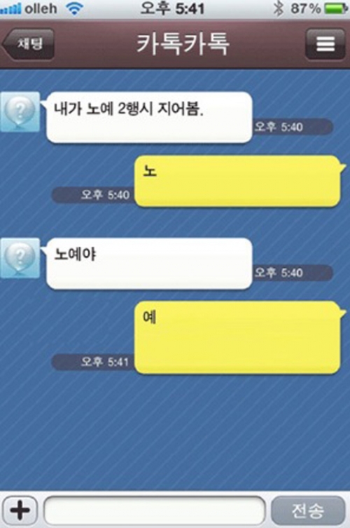 카카오톡에는 한 친구가 "내가 노예 2행시 지어봄"이라고 운을 뗐고, 이에 다른 친구가 한 글자씩 운을 띄워줬다.
