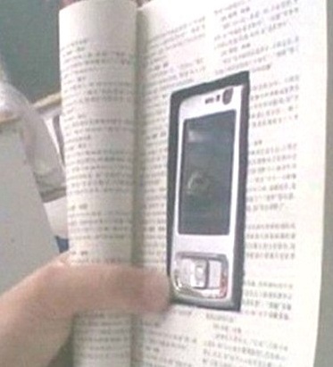 사진 속에서 볼 수 있듯 공부를 하는 듯 보이는 학생은 책 속의 일부분을 휴대폰 크기로 파내 해당 부분에 휴대폰을 집어 넣었다. 강사 입장에서 보면 영락없이 책을 들여다보고 있는 장면으로 밖에 볼 수 없는 기발한 방법이다.