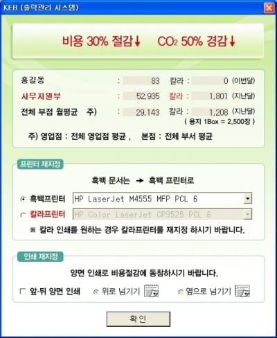 출력관리시스템은 사용자 본인의 현재 사용량, 소속 부점의 월 사용량, 전체 부점의 월 평균사용량을 PC 화면에 출력해 인쇄시마다 스스로 인쇄현황을 파악할 수 있도록 지원하는 것이 특징. 무의식적인 컬러 인쇄 방지를 위해 흑백 프린터를 기본 프린터로 지정했고, 용지사용 감축을 위해 양면인쇄를 손쉽게 선택할 수 있도록 팝업 화면을 구성, 용지비용 절감 효과를 기대할 수 있도록 했다.