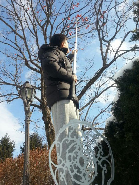 공개된 사진 속 박진영은 긴 막대를 이용해 감나무에서 감을 흔들고 있다.