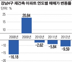 최근 5년간 강남4구 재건축 아파트값 변동률을 살펴보면 2008년 금융위기의 영향으로 -16.18% 하락했다가 이듬해인 2009년 20.84%로 회복하는 듯 했다. 그러나 2010년 -2.62%로 다시 떨어진 데 이어 2011년 -5.84%, 2012년 현재 -9.59%로 3년째 내리막길을 걷고 있다.