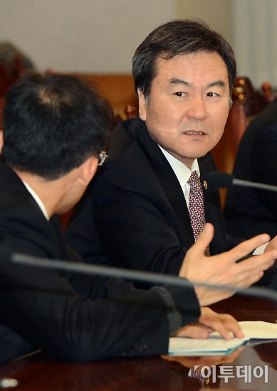 신제윤 기획재정부 차관이 13일 오전 서울 명동 은행회관에서 열린 긴급 거시경제금융회의에 참석해 추경호 금융위 부위원장과 이야기를 나누고 있다.