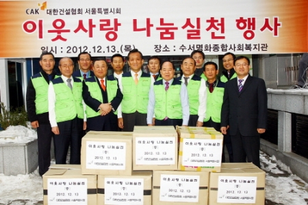 박종웅 건협 서울시회 회장은 “서울시 건설업계의 작은 정성이 어르신들께서 추운 겨울을 이겨내시는데 따뜻한 도움이 되시길 바라며, 어렵고 힘든 이웃들에게 지속적인 관심을 가지고 이웃사랑 봉사활동을 펼쳐 나갈 계획” 이라고 말했다.