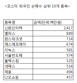 17일 코스닥 외국인 순매수 상위 10개 종목