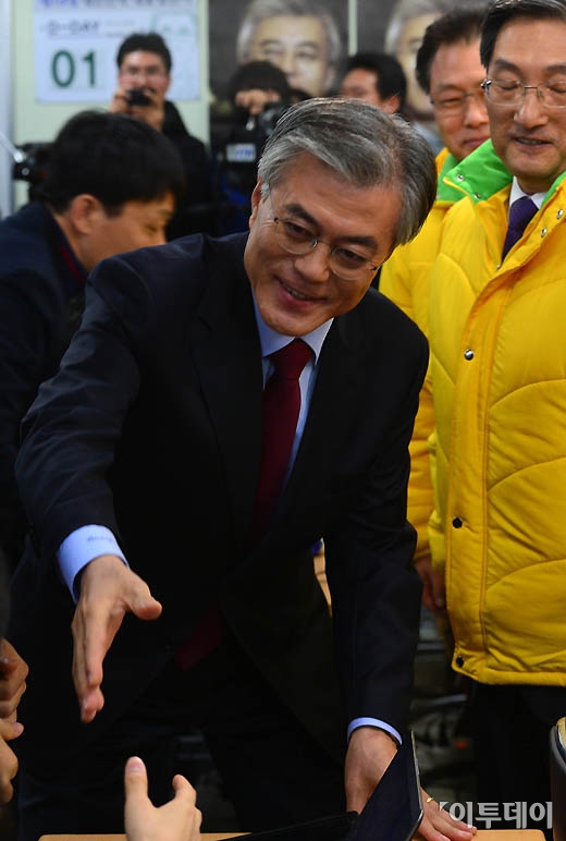 문재인 민주통합당 후보가 18일 서울 영등포 중앙당사에서 기자회견을 마친 후 취재진과 악수를 나누고 있다.