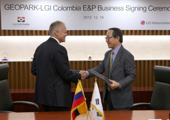 LG상사는 18일 서울 여의도 LG트윈타워에서 하영봉 LG상사 사장과 제임스 파크 지오파크 사장이 만나 LG상사가 지오파크 콜롬비아의 지분 20%를 광구개발비를 포함해 총 2400만 달러(약 257억원)에 매입하는 것을 골자로 한 지분양수도 계약을 체결했다고 밝혔다.