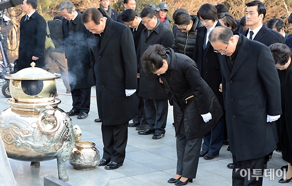 박근혜 제18대 대통령 당선자가 20일 오전 동작구 국립현충원을 참배한 후 故 박정희 전 대통령 묘소를 찾아 분향하고 있다.