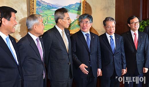 김중수 한국은행 총재가 21일 오전 서울 중구 남대문로 한국은행 본관에서 열린 ‘12월 금융협의회’에서 시중은행장들과 이야기를 나누고 있다. 이날 금융협의회에는 민병덕 국민은행장, 이순우 우리은행장, 신충식 농협은행장, 조준희 중소기업은행장, 윤용로 외환은행장, 하영구 한국씨티은행장, 김용환 수출입은행장, 이주형 수협 신용대표이사 등이 참석했다.