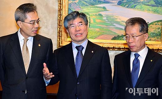 김중수 한국은행 총재가 21일 오전 서울 중구 남대문로 한국은행 본관에서 열린 ‘12월 금융협의회’에서 시중은행장들과 이야기를 나누고 있다. 이날 금융협의회에는 민병덕 국민은행장, 이순우 우리은행장, 신충식 농협은행장, 조준희 중소기업은행장, 윤용로 외환은행장, 하영구 한국씨티은행장, 김용환 수출입은행장, 이주형 수협 신용대표이사 등이 참석했다.
