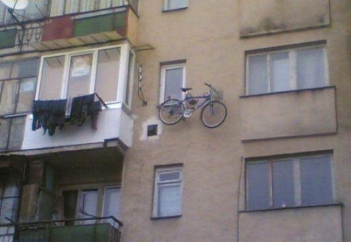 이 사진은 헝가리의 한 아파트에서 촬영됐다. 자전거 주인이 어떠한 생각을 가지고 창문 밖에 놓았는지 이유는 나와있지 않다.