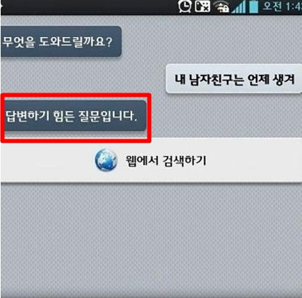 공개된 사진은 스마트폰 인공지능 프로그램과 한 여성의 대화 내용을 담고 있다. 프로그램이 ‘무엇을 도와드릴까요’라고 질문하자 휴대폰 주인은 ‘내 남자친구는 언제 생겨’라고 묻는다. 이에 휴대폰은 ‘답변하기 힘든 질문입니다’라고 답해 휴대폰 주인을 실망케 했다.