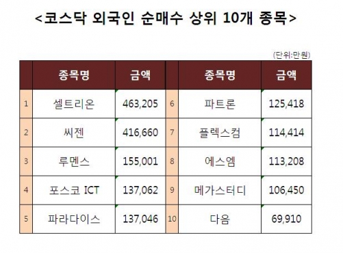 24일 코스닥 외국인 순매수 상위 10개 종목