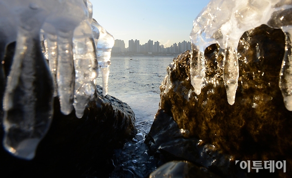 서울 아침기온이 영하 14.5도를 기록하는 등 올 겨울 들어 가장 추운 날씨를 보이고 있는 26일 서울 한강이 꽁꽁 얼어붙었다. 이번 한파는 내일 아침에도 이어진 뒤 주말엔 눈, 비가 오면서 잠시 풀릴 예정이다.