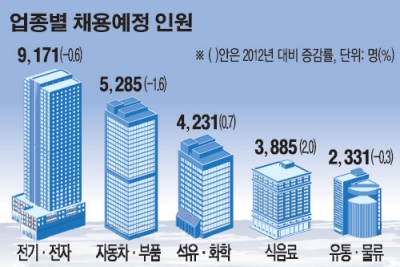 채용 계획을 확정한 288개사의 내년 채용예정 총 인원은 3만2521명. 이는 올해 채용한 3만2936명보다 1.3% 줄어든 수치다. 26일 대한상공회의소는 최근 상위 500대 기업을 대상으로 조사한‘2013년 500대 기업 일자리 기상도’결과를 밝혔다.