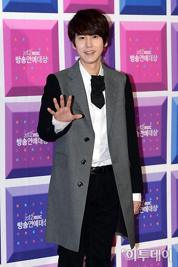 슈퍼주니어의 규현이 29일 오후 여의도 MBC에서 열린 ‘2012 MBC 방송연예대상’ 시상식에 참석하며 취재진을 향해 포즈를 취하고 있다.