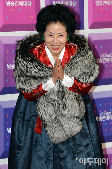 탤런트 선우용녀가 29일 오후 여의도 MBC에서 열린 ‘2012 MBC 방송연예대상’ 시상식에 참석하며 취재진을 향해 포즈를 취하고 있다.
