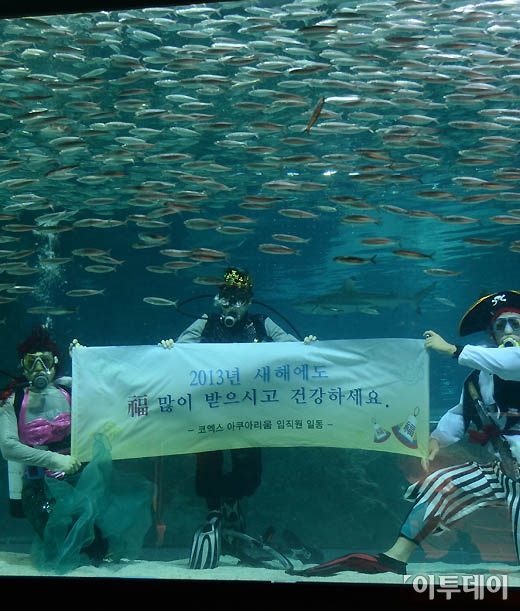 계사년을 이틀 앞둔 30일 서울 삼성동 코엑스 아쿠아리움에서 다이버들이 새해인사를 전하고 있다.