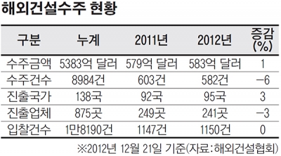해외건설협회는 작년 1월부터 그해 12월 21일까지 국내 건설사들이 협회에 등록한 해외 수주는 모두 582건, 583억 달러(약 62조4700억원) 규모로 전년 같은 기간(603건, 579억 달러)보다 10%정도 늘었다고 밝혔다.