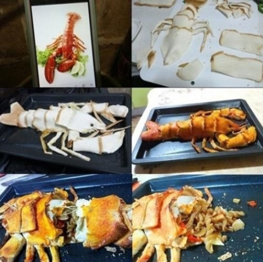 하지만 그 모양이 랍스터와 거의 비슷해 언뜻 보면 마치 잘 요리된 랍스터를 보는 듯 하다. 비록 ‘랍스터 모양 요리’지만 정성은 랍스터 못지 않다. 내용물을 요리해 오븐판 위에 잘 정리하고 그 위에 식빵을 랍스터 껍질 모양으로 잘 잘라 위에 엎어 오븐에 정성스럽게 구워낸 하나의 작품이다.