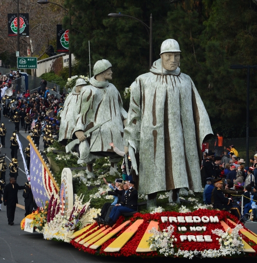 한국전쟁 참전 용사들이 1일(현지시간) 미국 캘리포니아 패서디나에서 열린 124번째 새해 축하 행사 ‘로즈퍼레이드’에 참가해 행진하고 있다. 제임스 매키친 등 6명의 참전 용사들은 국방부 산하 한국전쟁 60주년 기념사업회가 마련한 ‘자유는 거저 주어지는 것이 아니다’라는 글귀가 새겨진 꽃마차를 타고 행진했다. 캘리포니아/UPI연합뉴스