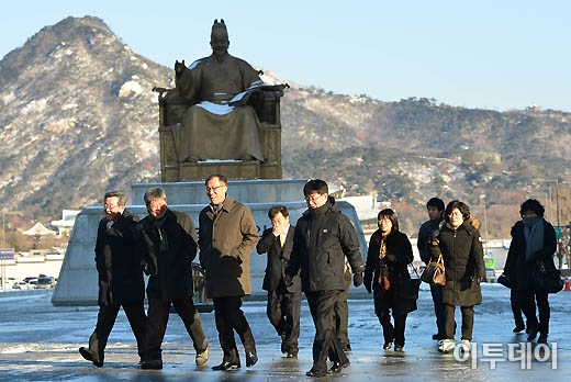 올해 첫 한파주의보가 발령된 2일 서울 광화문광장에서 시민들이 힘찬 발걸음으로 첫 출근길에 나서고 있다.