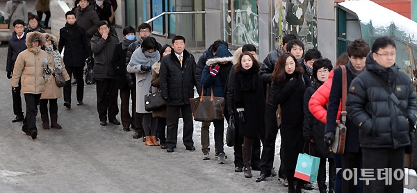 2013년 계사년 새해가 밝았다. 서울 아침기온이 영하 16도까지 떨어지는 등 한파특보가 발효된 2일 오전 대방역 인근에서 직장인들이 몸을 움츠리며 버스를 기다리고 있다.