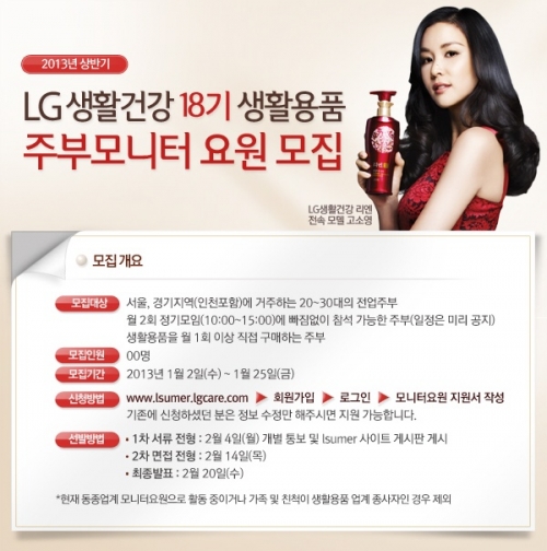 LG생활건강은 생활용품 브랜드의 신제품 개발 및 평가에 참여할 주부 모니터요원을 모집한다고 2일 밝혔다.