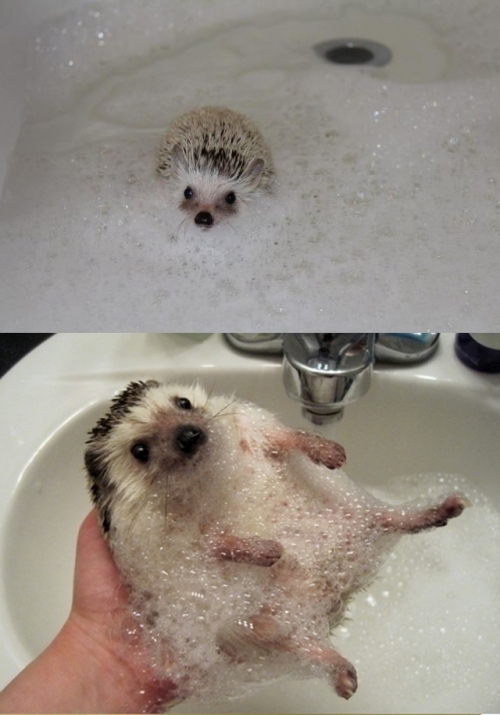 이 남성은 세면대에서 작은 고슴도치 한 마리를 거품 목욕시키고 있다. 이 고슴도치는 목욕이 즐거운 듯 기분 좋은 표정을 짓고 있다.