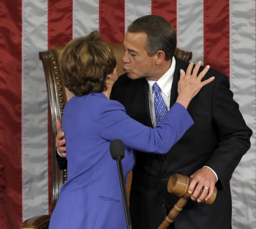 미국 공화당 소속 존 베이너 하원의장이 3일(현지시간) 113대 의회에서 재선에 성공한 뒤 민주당 소속 낸시 펠로시 하원 원내대표에게 키스를 하고 있다. 베이너 의장은 이날 펠로시 원내대표와 의장 자리를 놓고 표결을 거친 끝에 32표 차이로 의장직을 지켜냈다. 워싱턴/AP연합뉴스