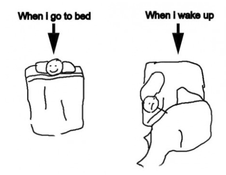 사진 속에는 잠 자기 전 침대에 반듯하게 눕지만 아침에는 흐트러진 모습이 담겨있다. 잠을 자면서 이리저리 움직이고 이불을 차는 등의 행동으로 어질러진 것이다.