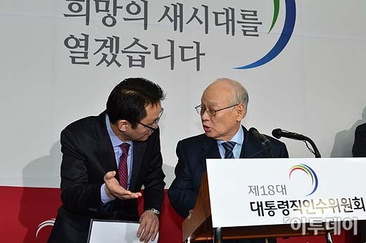 김용준 대통령직 인수위원장(오른쪽)이 4일 오후 서울 종로구 삼청동 금융연수원에서 박근혜 대통령 당선인이 임명한 인수위원 명단을 발표하기 직전 윤창중 대변인과 이야기를 나누고 있다.