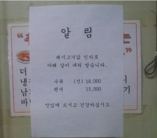 고깃집 사장은 "1만8000원 받던 수육을 1만5000원으로 인하하겠다"며 "맛있게 드시고 건강하십시오"라는 친절한 글을 올려놨다.