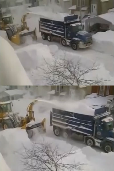 영상 속 캐나다 제설작업에는 두 대의 차량이 이용된다. 차량 한 대가 눈을 빨아들여 옆 트럭에 내 뿜는 방법이다.