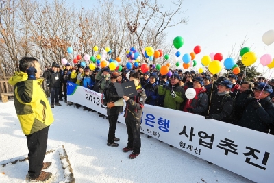 은행장과 임직원들이 한 마음으로 청계산 정상에 올라 올해 성공적인 사업목표 달성을 결의하고, 새 출발 의지를 담은 풍선 날리기 행사도 가졌다.