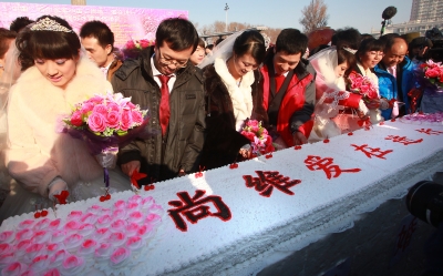 러시아 인근의 중국 헤이룽장성 하얼빈에서 6일(현지시간) 20쌍의 커플이 야외에서 합동결혼식을 올렸다. 이날 기온은 영하 25도를 기록했다. 하얼빈/UPI연합뉴스
