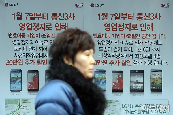 LG유플러스가 7일 영업정지를 시작하면서 이동통신 3사가 돌아가며 66일간 영업정지에 들어간다. LG유플러스는 1월 7일~30일(24일), SK텔레콤은 1월 31일~2월 21일(22일), KT는 2월 22일~3월 13일(20일)까지 영업 정지된다. 이 기간에는 대리점이나 판매점에서 영업정지 이동통신사의 휴대폰 서비스에 신규로 가입할 수 없으며, 다른 이동통신사에 가입한 사람이 영업정지 이동통신사로 번호를 이동하는 것도 중단된다. 7일 오전 서울 시청역 인근 LG유플러스 대리점에 영업정지를 알리는 안내문이 붙어있다.