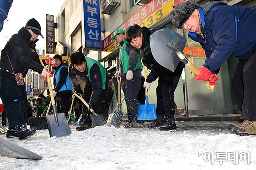 최근 내린 눈이 지속된 한파로 빙판길로 변하면서 낙상사고가 빈번하게 발생하고 있는 가운데 7일 오전 서초구 일대에서 100여명의 서초구청 직원들과 주민자원봉사자들이 빙판길 제거작업을 하고 있다.