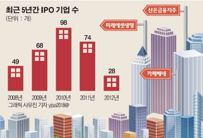 7일 한국거래소에 따르면 지난해 IPO 건수는 28건을 기록했다. 공모규모는 총 1조원을 겨우 넘겼고 공모규모 기준으로 2011년(4조2557억원)의 4분의 1수준으로 2008년 이후 4년 만에 가장 저조한 수치다.