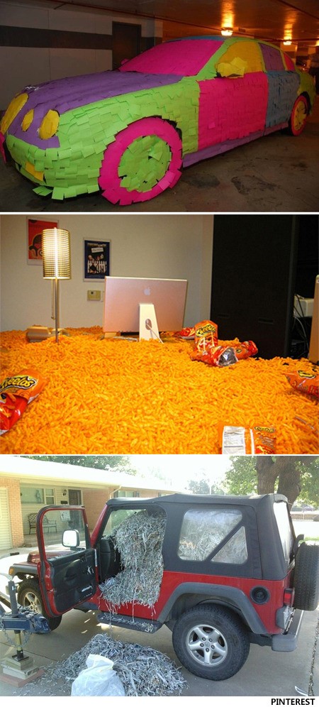 '상상 이상의 장난들' 사진 속에는 다양한 색깔의 포스트잇을 빼곡히 붙인 자동차의 모습이 담겨있다. 자동차 전체를 이처럼 포스트잇으로 덮은 것으로 미루어 엄청난 공이 들어간 것으로 보인다. 자동차 내부를 폐지로 가득 채운 장난도 상상 이상이다.